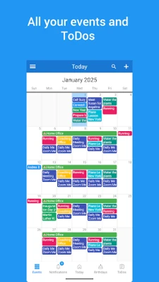 • Add pictures to events, set reliable reminders, group entries using categories and more than 40 colors for your events and to-dos.