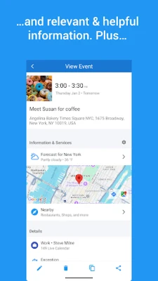• Perfect when on the move: Get maps, navigation, local weather forecasts for each of your destinations, and top places nearby – we place your events in real-world context and enrich them with up-to-date data.