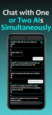 - Dual AI for Smarter Conversations: Chat with one or two AI assistants at once. Effortlessly switch between advanced AI models like ChatGPT and Gemini for diverse perspectives, intelligent solutions, and in-depth insights.