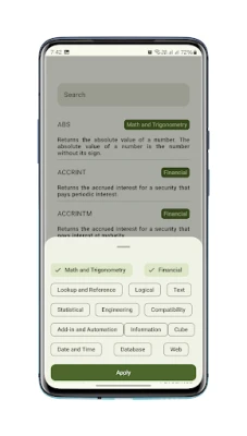 MS-Excel has many functions and formulas divided into many categories and they are Financial, Math and Trigonometry, Logical, Date and Time, Compatibility, Lookup and Reference, Information, Add-in and Automation, Text, Engineering, Database, Statistical and Web. All Things Excel lists lets you filter according to these categories. Most of these functions and formulas match with Google Sheets too.