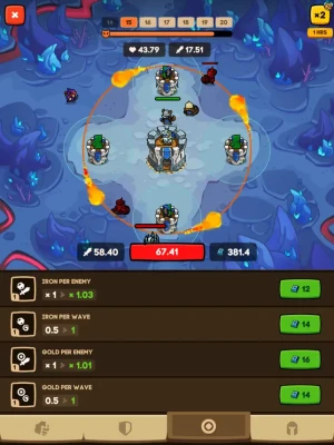 Use iron during battle to manage resources, grow power and defense of your tower. After battle wisely invest gold into permanent upgrades. Pay attention to the long-term perspective and unlock new abilities, allowing you to make game-changing improvements.