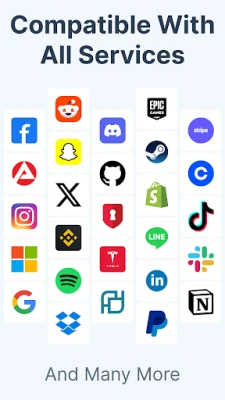 Works with Google, Microsoft, Facebook, Instagram, Amazon, TikTok, Discord, Twitter, Snapchat, LinkedIn, PayPal, Binance, Coinbase, Kraken, Roblox, Steam, GitHub, GitLab, Slack, Notion, Dropbox, and thousands more.