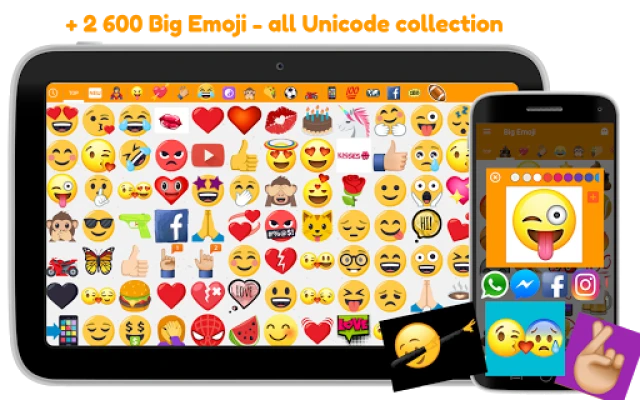 Big Emoji will give you access to all standard emojis categories, plus some special ones as a trendy category with some DAB or Trump stickers and a love dedicated zone.
