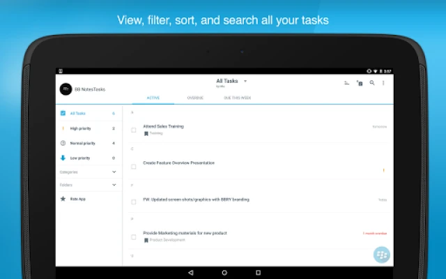 BlackBerry Tasks is an enterprise PIM application that allows you to create, edit, and manage tasks that are synchronized with Microsoft® Exchange.
