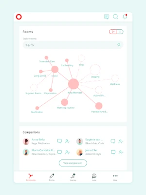 - We have private and safe rooms where you can share your insights and health experiences with other people going through similar journeys. Anonymously and securely.