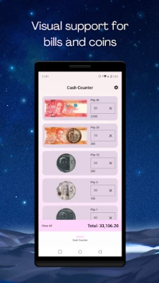 This money counter app has a simple, straightforward, user-friendly interface designed for quick input and totals. It supports dark mode. It also supports dynamic colors based on your wallpaper for Android 12 and up.