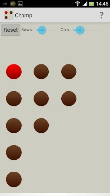 Chomp is a game of logic and strategy, played against the computer. By touching one of the pills, that one and all to the right and below it are captured. The brown ones are delicious chocolate pills, but the red one tastes bitterly. So the object of the game is to leave the red pill to your opponent.