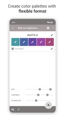 Create color palettes and patterns easily, by setting parameters, like general palette lightness, hue and saturation. After creating a base color pattern, every color on the palette can be specialized or fine-tuned. Using the rows/columns edit function, the row lightness and column hue can also be edited.