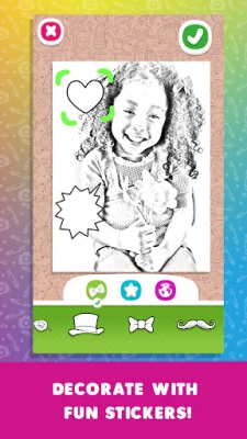 It's quick, easy and fun. Use any photo on your device or take a new one. Watch the color drain away and adjust the special filter to get a great result on almost any photo. Decorate with silly stickers like costumes and speech bubbles. Now you are ready to print at home and color!