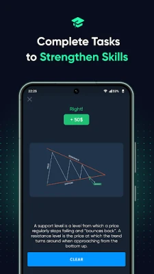 🏅 Unlike the majority of other stock apps, this one comes with an unlimited demo budget. Take quizzes to earn virtual money and use it on simulator without spending a single dollar. Obtain real-world experience in the stock market demo that supports all kinds of assets and uses live charts!