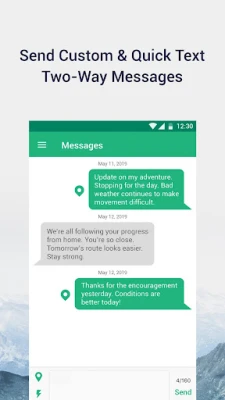 • Control and access all the features of your inReach device from the app: send 2-way custom or preset text and email messages, trigger an SOS from anywhere in the world, track your location and more