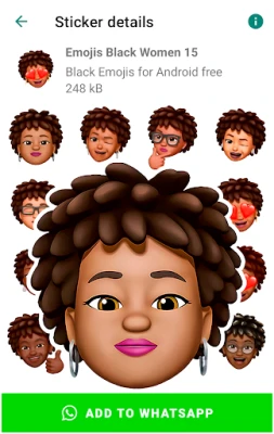 Black Memoji for Android characters with different themes added: Afro emoji, American emoji, black male emojis, black female emojis, free African American emojis for sharing them with your loved one, friends and family on social networks and chats.
