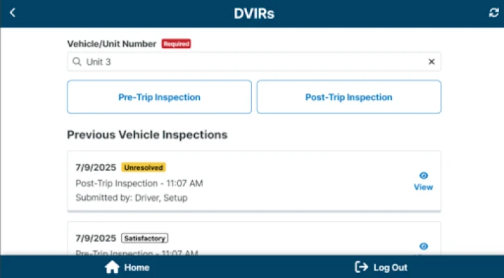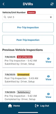 Unit Selection & DVIR Listing – Save time by selecting vehicles/units from a listing of all company equipment. Upon selection, the listing of unit related DVIRs (for the last 14 days) will be displayed, clearly identifying any DVIRs in need of review.