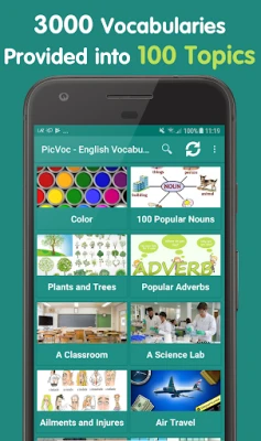 English vocabulary with more than 100 topics, 3000 vocabularies with pictures, pronunciation and meaning.