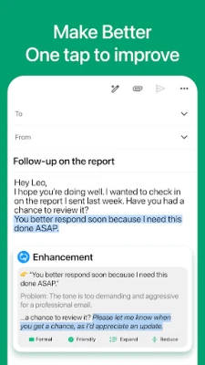 Say goodbye to awkward sentences and embarrassing grammar errors. With smart AI technology, you can instantly improve your writing quality and communicate your ideas more effectively — anytime, anywhere.