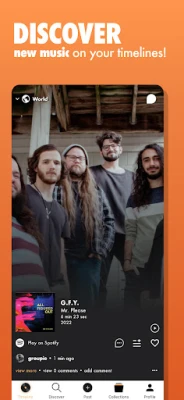 SWITCH TIMELINES to discover music shared throughout the entire Groupie Community via the WORLD timeline, or just what your friends are listening to via your FRIENDS timeline.