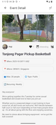 Browse sports activities happening around you on an interactive map. From yoga sessions in the park to weekend soccer matches, find exactly what you're looking for or discover something new. Filter by sport, distance, skill level, and time to match your schedule perfectly.