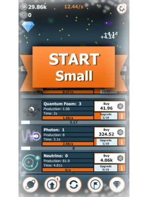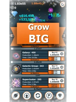 • Get even bigger with prestige! Every time you restart the game, you will obtain Antimatter, which can be used to buy permanent super upgrades!