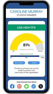 - Supporter Convenience: Friends and family can purchase or donate through a secure e-commerce page—accessible via links or QR codes—using credit or debit cards. A progress graphic shows individual and organization profit goals in real time.