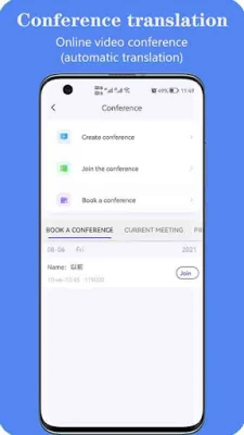 This APP contains a complete cloud conference system. You can hold a multinational conference through this APP, and the language in the conference will be translated in real time.