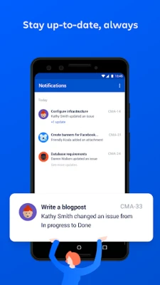 The Jira Data Center app lets teams who use Jira collaborate and give updates from anywhere.