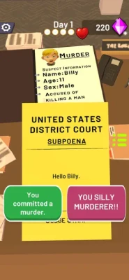 Every criminal has his or her judgment day!and it’s your day to show your skills as the town judge. Send suspects to “heaven or hell” and serve as the angel of justice.Now is your chance to be the judge and inflict your justice on a wide variety of cases.Who’s guilty and who’s not...it’s up to you to drive to the truth!You will face rubbery, fraud and murder cases which will require you to run your own courtroom, question witnesses, analyze and detect clues and evidence, read reports, and pass sentences and verdicts!The town’s justice system is in your hands…As the judge you will face moral dilemmas in every turn, guilty criminal masters will try to bribe you and acquaintances will turn to you for benefits and shortcuts in the tangled world of justice enforcement...the choices and decisions will be yours, what’s right and what’s wrong?Again...you will be the judge. So don't wait another day because it is judgment day today! The guilty and innocent await your gavel!