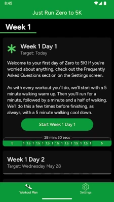 - Zero to 5K: Gets you from absolute zero running experience to 5K in just 9 weeks, with three 30-minute workouts per week