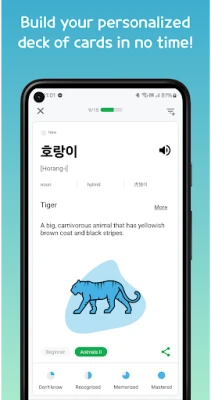 • Each Korean flashcard has several example sentences, dictionary definition, and audio from a native speaker.