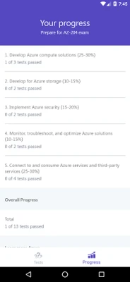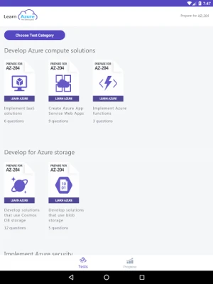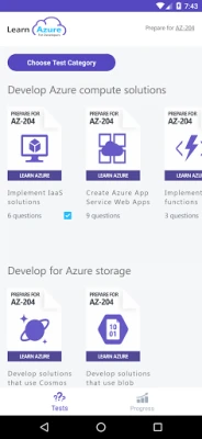 App contains 13 unique tests which cover all topics from the AZ-204 Microsoft Certification test.