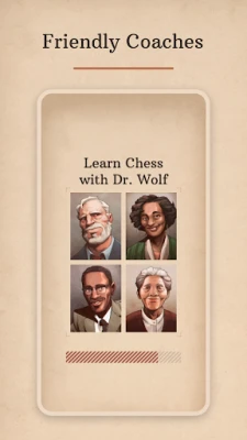 Dr. Wolf will coach you for free for 3 games of chess so that you can appreciate his style of in-game teaching. Then, to continue learning, you can subscribe to Coaching. With Coaching, Dr. Wolf teaches while you play chess, pointing out good moves and bad –both yours and his — and the reasoning behind them. At times, he'll gently suggest you reconsider a move, or ask a question at a critical moment. Plus, you get unlimited hints, unlimited undos, and unlimited access to our Lesson Library, with over thirty lessons in