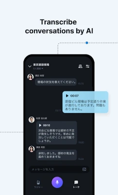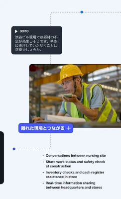 Next-generation App, that can be connected each work sites by only smartphone.Simple operation, transcribe function also connection with LINE WORKS.Voice communication on your site will be supported strongly.