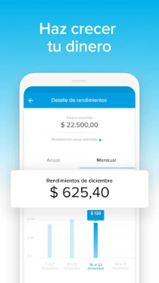 Rendimientos diarios: Genera rendimientos diarios en tu cuenta, es simple y lo activas a través de la app. Transfiere dinero con tarjeta de débito o dinero en cuenta y efectivo en tiendas.