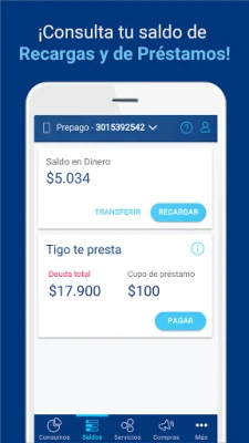 • Consultar saldo, consumos o detalles de movimiento de datos, minutos y SMS de tu línea Tigo. También podrás consultar saldos y recargas de Tigo Te Presta que incluyen información de deuda y del cupo del préstamo disponible.