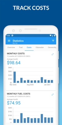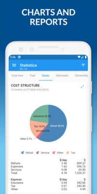 • Beautiful charts for fuel efficiency, fuel price, cost structure, monthly costs
