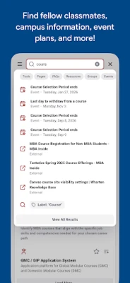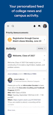 - View a centralized calendar of events including your personal course schedule - Keep updated on announcements and alerts relevant to you - View your pertinent degree information and connect with your advisor - Join groups and discussions - Access your most important resources and tools through your saved links= - Search and connect with staff, other students, systems, groups, posts, resources, and more