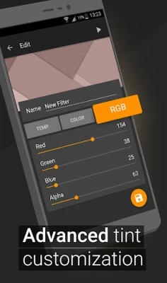 π RGB customization - Set the amount you wish of the red, green, or blue color in your filter and how much you want the screen to become dimly lit. Create your night filter.