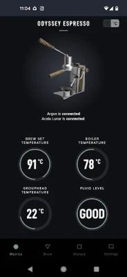 - Shows metrics about the Odyssey Espresso Argos like brew set temperature, boiler temperature, group-head temperature, fluid level.