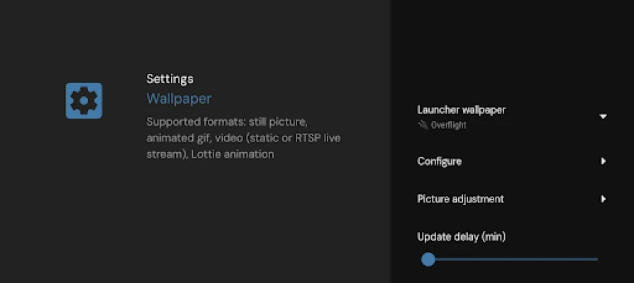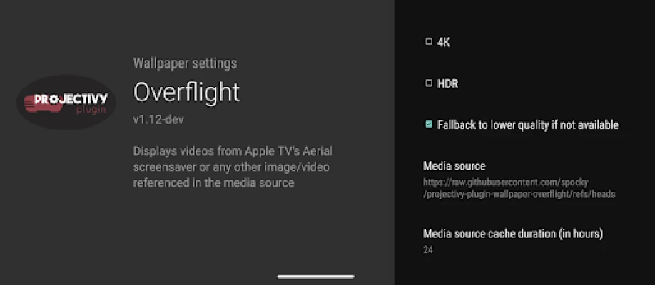 Note : - this plugin requires Projectivy Launcher Premium - it won't be visible in your launcher icons, apply it from Projectivy Settings / Appearance / Wallpaper. - it can be uninstalled from Android Settings / Application. - the JSON format expected can be found here : https://github.com/spocky/projectivy-plugin-wallpaper-overflight