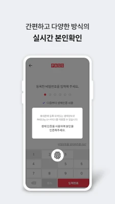 - 본인확인 : PASS앱을 통해 비밀번호,생체인증을 통한 간편본인확인 및 인증내역 조회 가능