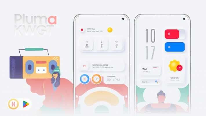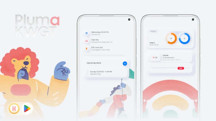 Pluma KWGT is designed for **minimalist, neumorphic home screen designs**, offering an initial collection of **40+ widgets**, with **monthly updates** introducing new additions.