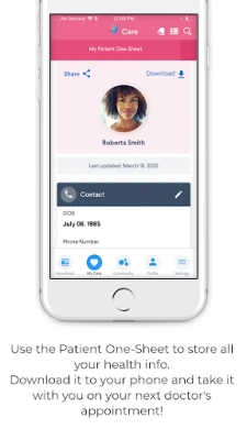 • Keep everything in one place with our Patient One-Sheet, a secure, printable, and shareable form that allows you to easily store and maintain all your basic information – doctors, insurance info, medications, and their dosages, and other key data.