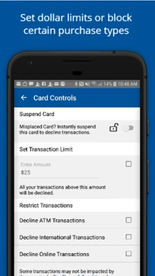• push notification or email alerts about various card activity • card controls • travel notifications • balances • transaction history • and more!