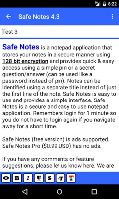 Safe Notes is a notepad application that stores your notes in a secure manner using 128 bit encryption and provides quick & easy access using a simple pin number or a secret question/answer (can be used like a password instead of pin). Notes can be identified using a separate title instead of just the first line of the note. Safe Notes stores all your data on the device instead of uploading your personal information to the internet. Safe Notes is easy to use and provides a simple interface. Safe Notes is a secure and easy to use notepad application.