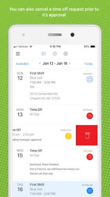 View your scheduled shifts, pick up open shifts, request time off and swaps simply with a swipe and tap! Receive notifications, emails or texts when your schedule is published and when shifts become available. Find out immediately when a time off request is approved and view the status of requests right from the app.