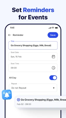 Set reminders for important calls, meetings, birthdays, and deadlines. Create task lists and manage priorities directly inside your calendar schedule. Stay organized with a powerful yet simple reminder system built for everyday productivity.