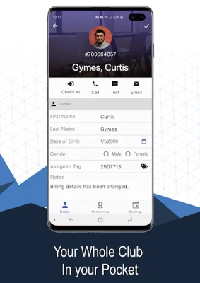 Access member details, check them in and send them SMS, Emails or make calls from your device.
