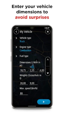 - Specify your vehicle’s dimensions to get routes tailor-made for your vehicle