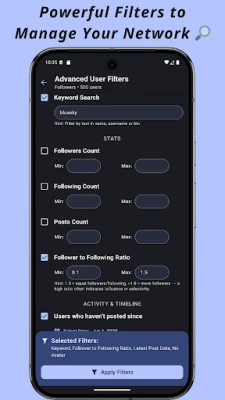 ✅ Advanced Filters: Filter users in your Bluesky network based on keywords, follower count, follower to following ratio, activity level, timeline and engagement for better targeting and analysis.