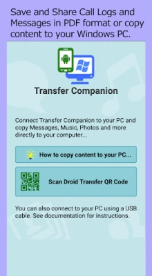 Transfer Companion provides additional functionality when used with PC Application "Droid Transfer". Using Transfer Companion and Droid Transfer together - you can backup messages, music, photos and other files on your Android Phone. Communication between your PC and your phone is completely local either over a Wi-Fi or a USB connection, and no information is stored, uploaded to the Cloud, or transmitted to a third party.
