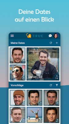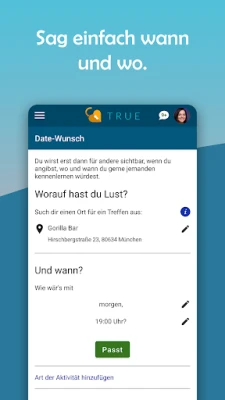 Dazu schlagen wir dir wunderschöne Dating-Orte vor, an denen dein Date stattfinden kann. Du wählst Ort und Zeit für deinen Date-Wunsch. Andere Nutzer*innen blenden sich bei deinem Date-Wunsch als Kandidat*innen ein und du wählst deinen Partner oder deine Partnerin für dein Date direkt in der App aus. Somit steht bei True das Wichtigste ganz am Anfang des Kennenlernens: Ein echtes Date.